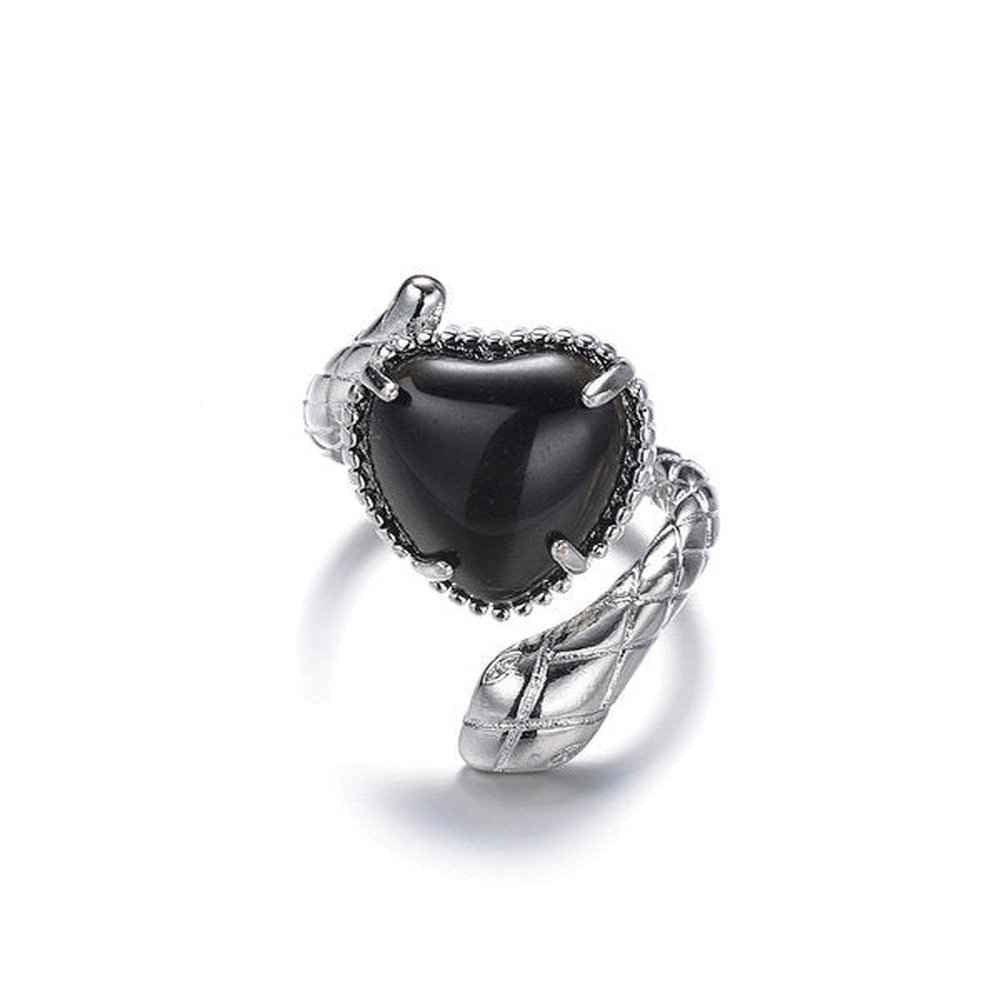 The snake, expertly crafted from brass, coils gracefully around your finger, with its tail elegantly attached to a heart-shaped black obsidian gemstone. This stylish and unique black obsidian ring is the perfect addition to your jewelry collection.