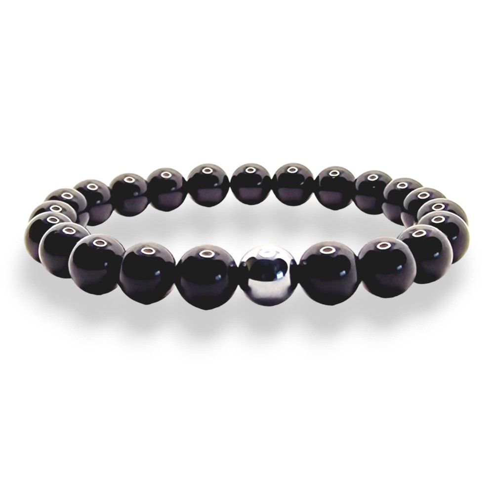 Crafted with meticulous attention to detail, this elasticated beaded bracelet features genuine 8 mm black tourmaline beads, beautifully complemented by a 8 mm silver-plated hematite bead.
