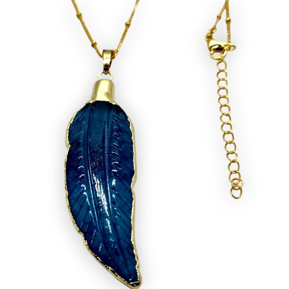 The pendant is crafted from brass and features a 14k gold plated finish that has been meticulously hammered to create a unique texture. The pendant is further enhanced by a gorgeous blue agate crystal that is securely set within it, adding to its overall beauty and allure.