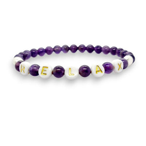 the Relax Bracelet with 6mm Amethyst beads, 2 pearls, and flat white beads with black leathers;