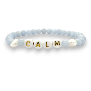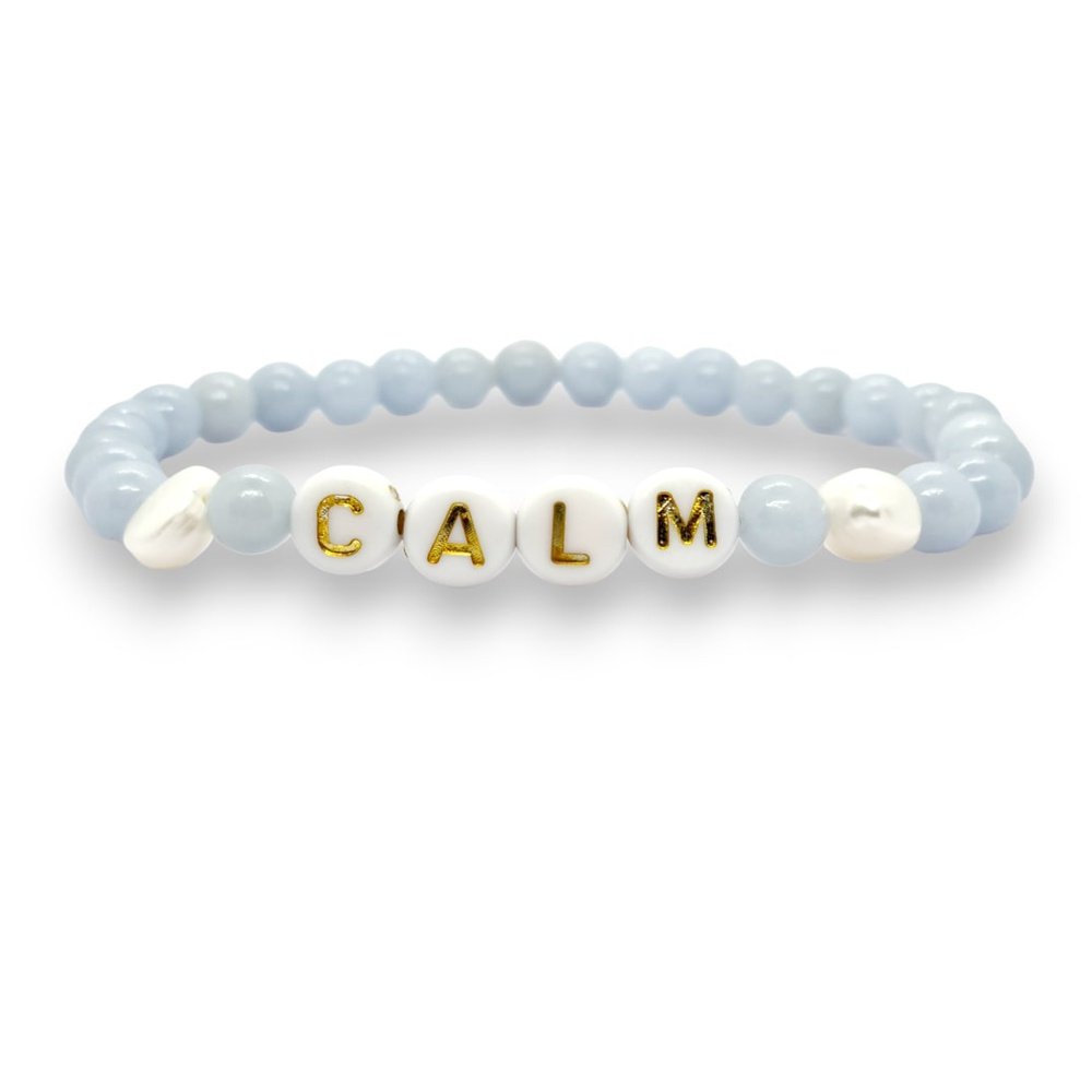 the Calm Bracelet with 6mm Angelite beads, 2 pearls, and flat white beads with black leathers;