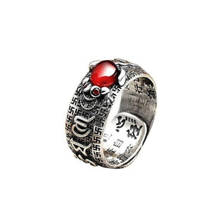 Made with high-quality materials, this retro handmade ring features a sterling silver Pixiu, a powerful amulet that symbolizes auspicious movement and warding off evil spirits. The Pixiu is inlaid with Red Garnet Stone, a crystal that is believed to bring luck and wealth.