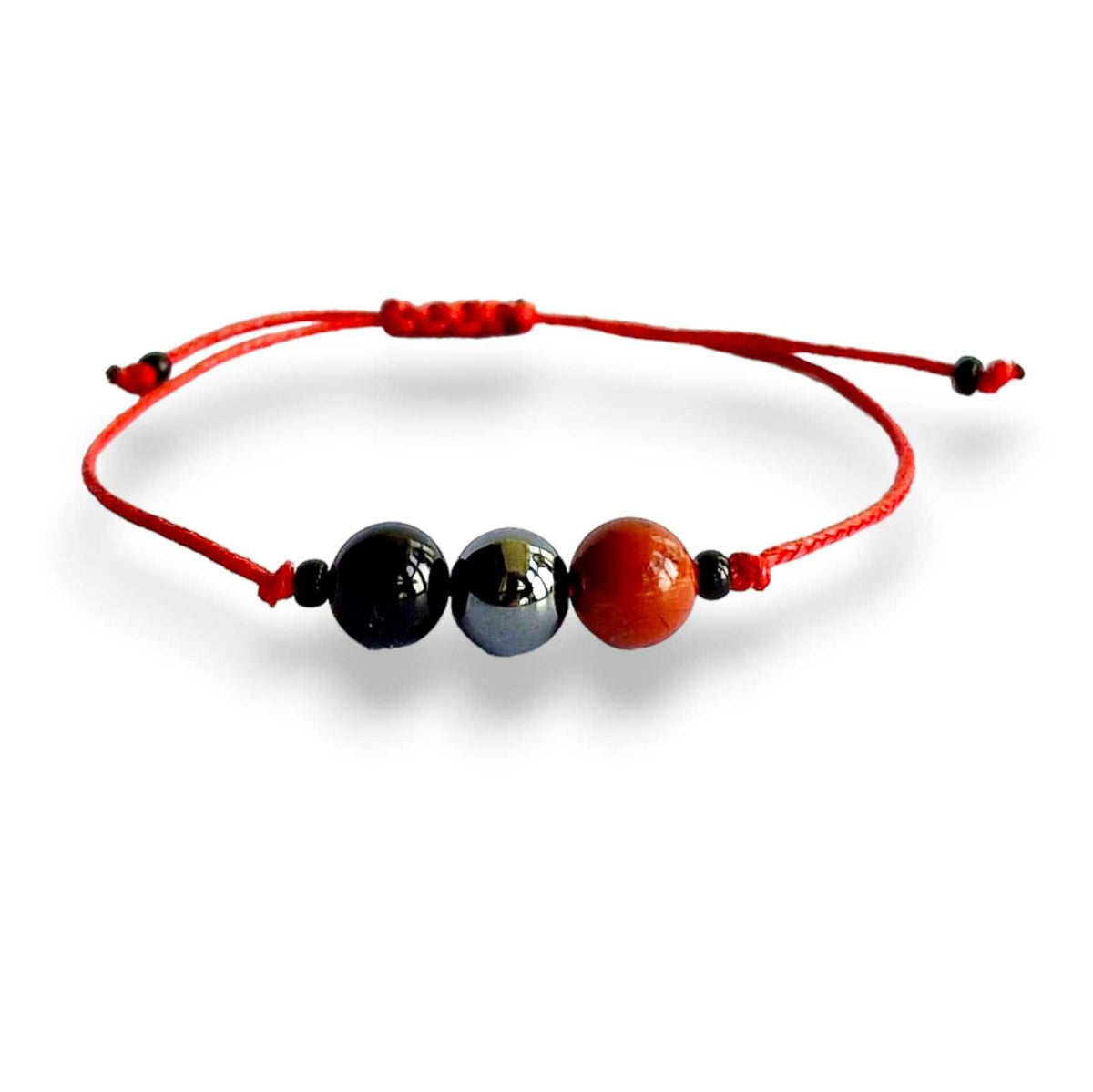 Featuring a potent trio of grounding crystals — Black Obsidian, Magnetic Hematite, and Red Jasper — this bracelet is designed to align and strengthen your root chakra, the energy center responsible for stability, security, and inner strength. The rich red cord adds a bold touch, amplifying the grounding power of these earthy stones.