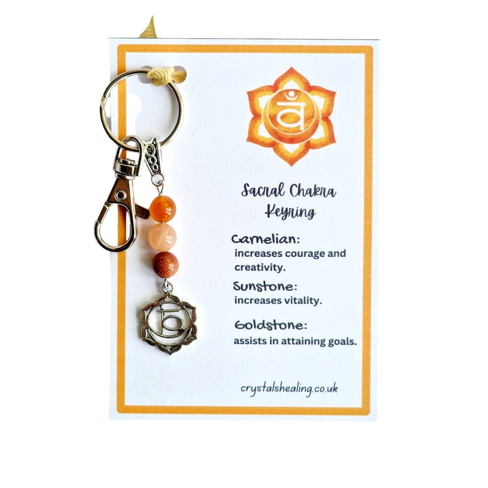 Accompanying the keyring is an information card offering insights about the sacral chakra and the healing attributes of the beads. This card acts as a convenient guide for those new to chakra healing and can be an excellent reference tool.