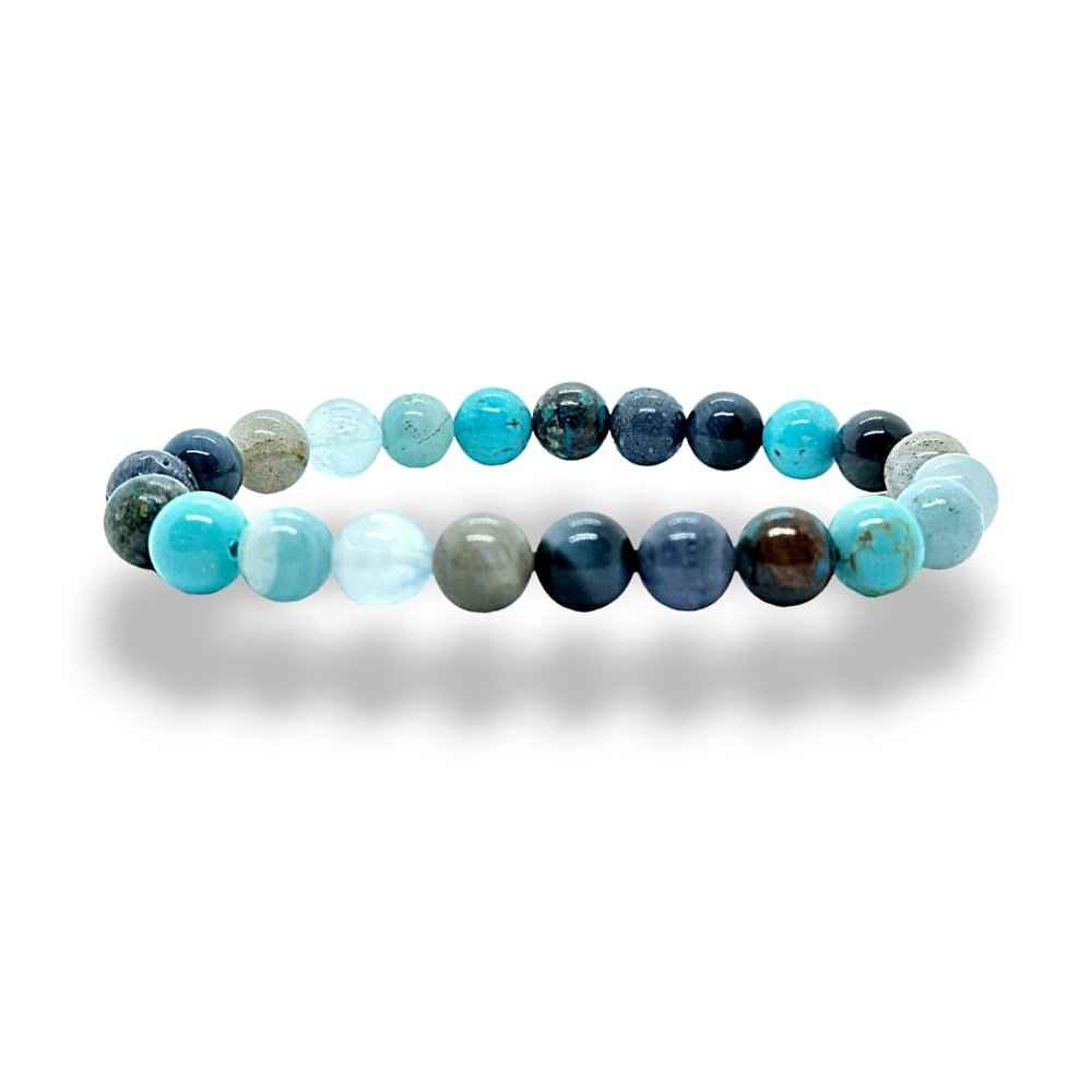 This Throat Chakra Bracelet is made with Blue Tiger's Eye, Blue Coral, Chrysocolla, Turquoise Howlite, Amazonite and Labradorite, all chosen for their properties that work well with the throat chakra.