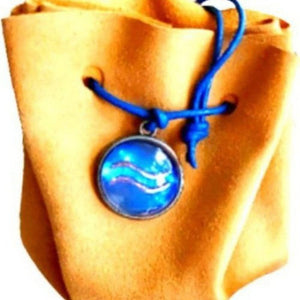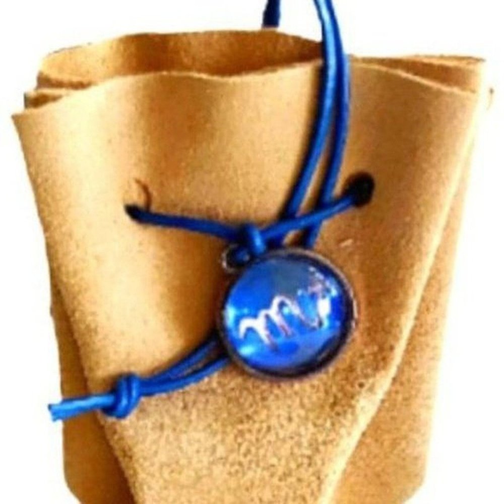 The This Zodiac Leather Pouch is hand made with lots of love, great care and good intentions 100% genuine suede leather in natural colour comes with a 100% genuine real leather thong cord in blue, a wooden bead and a 16mm sign of the zodiac glass cabochon charm in blue colour.